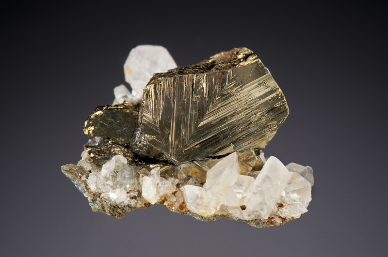 An exceptional specimen of Cubanite featuring a partial cyclic twin. Two of the twinned crystals are prominently displayed, with an additional two occurring as partial crystals. All of the crystals are complete, showing characteristic striations on all faces. The Cubanite is accented with nicely contrasting crystals of bladed white calcite. This piece has been repaired along the crack at the base of the main crystal.
