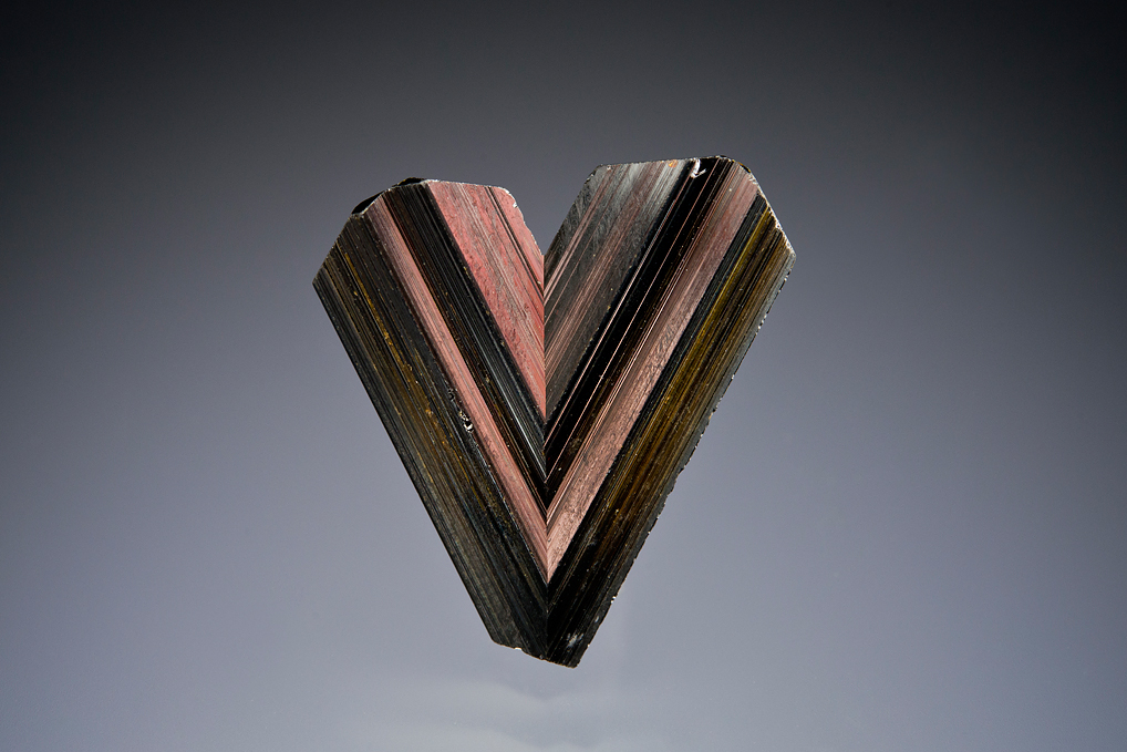 A beautifully twinned crystal of Brazilian rutile. A bright metallic luster and deep natural striations highlight the twin plane, and add a fabulous quality of geometrical aesthetic.