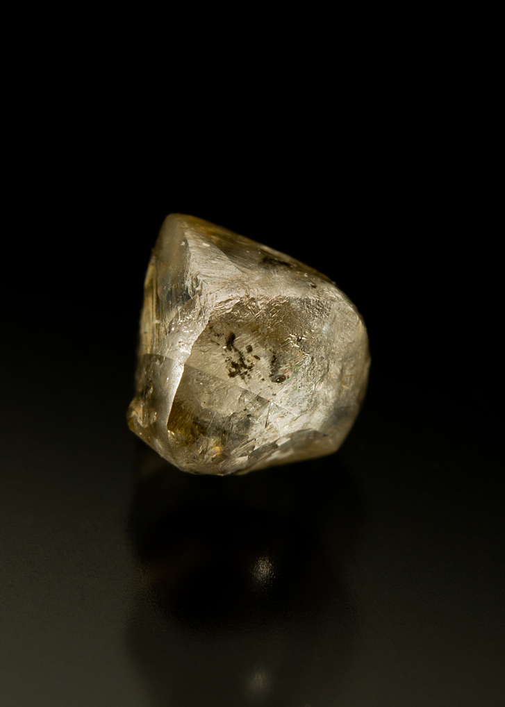 A fairly gemmy complete crystal exhibiting both octahedral and dodecahedral faces. A nice crystal with some graphite inclusions.