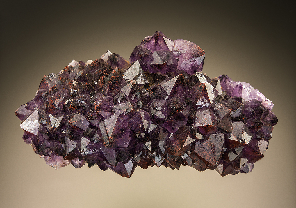 An intriguing plate exhibiting several styles of amethyst. On the top edge are two protruding crystals that show darker purple edges contrasting with the lighter faces of the termination. The bottom edge shows the classic dark purple amethyst with red inclusions, and the rest of the specimen is a range of color between these styles.