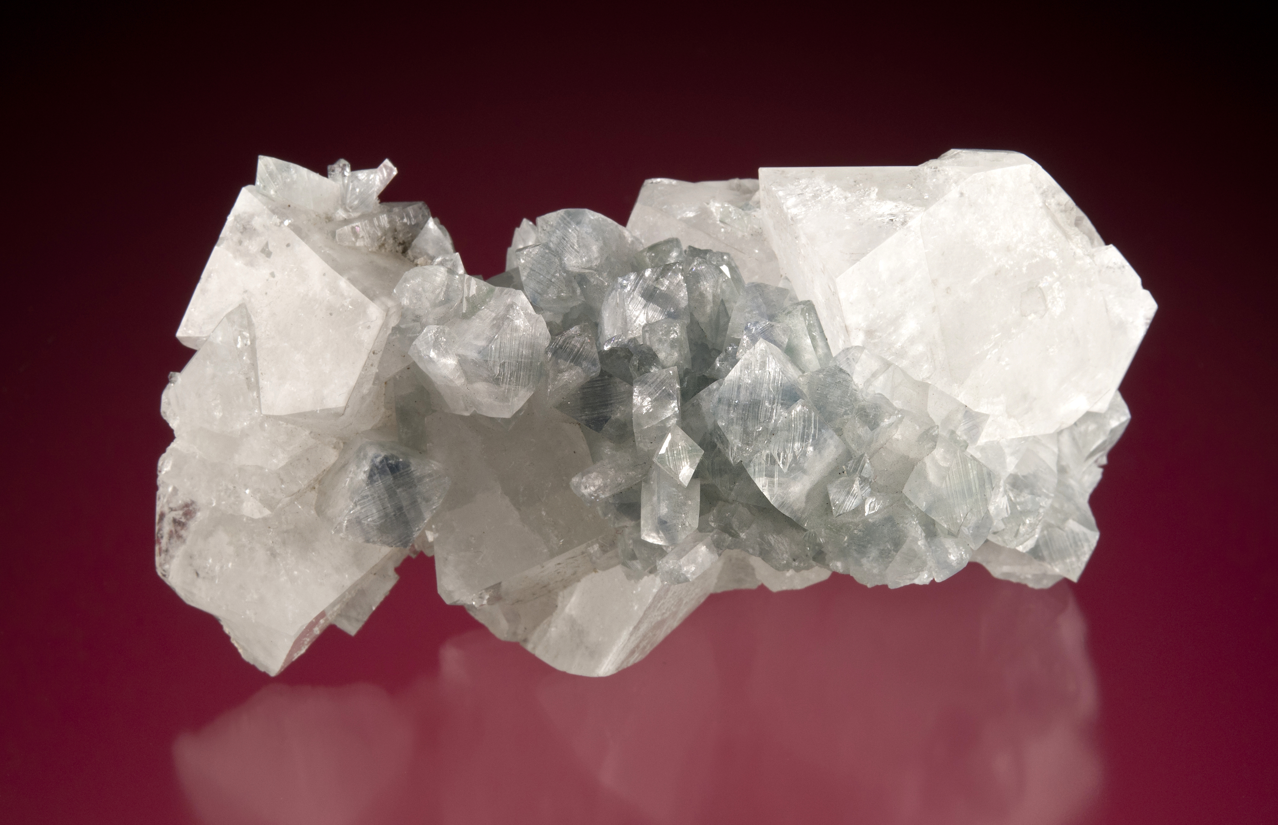 This is a wonderfully aesthetic combination specimen from the lower levels of the Billie Mine. A band of translucent, slate blue celestine crystals cuts diagonally across the center of a snow white cluster of well-formed colemanite. The color contrast and crystal form is superb, with the termination of each celestine crystal forming a nearly perfect diamond. There is a small amount of damage to the base of the specimen, which is largely obscured when the specimen is displayed from its face. This piece was featured in the Special Memorial Exhibit of the James & Dawn Minette Collection, and includes its original label.
