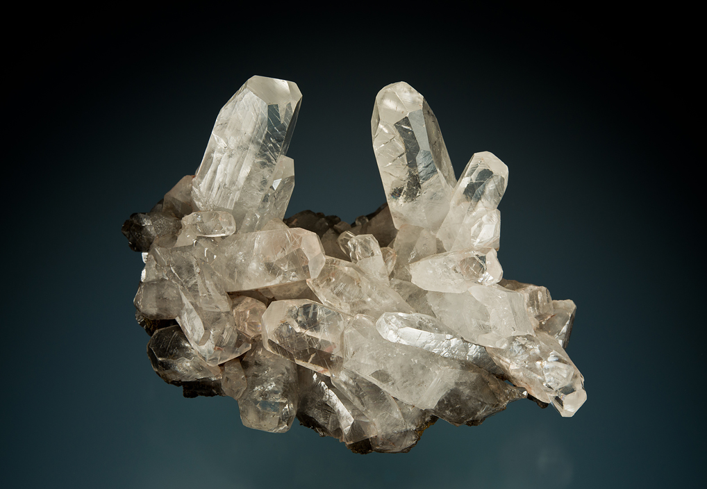 This is certainly one of the prizes in the Smith English suite. This is one of the most desirable habits of English calcite , and in a dramatically aesthetic group. The two crystals protruding from the plate are perfect and the only damage on the piece is near the edge of the plate. An elegant English calcite.