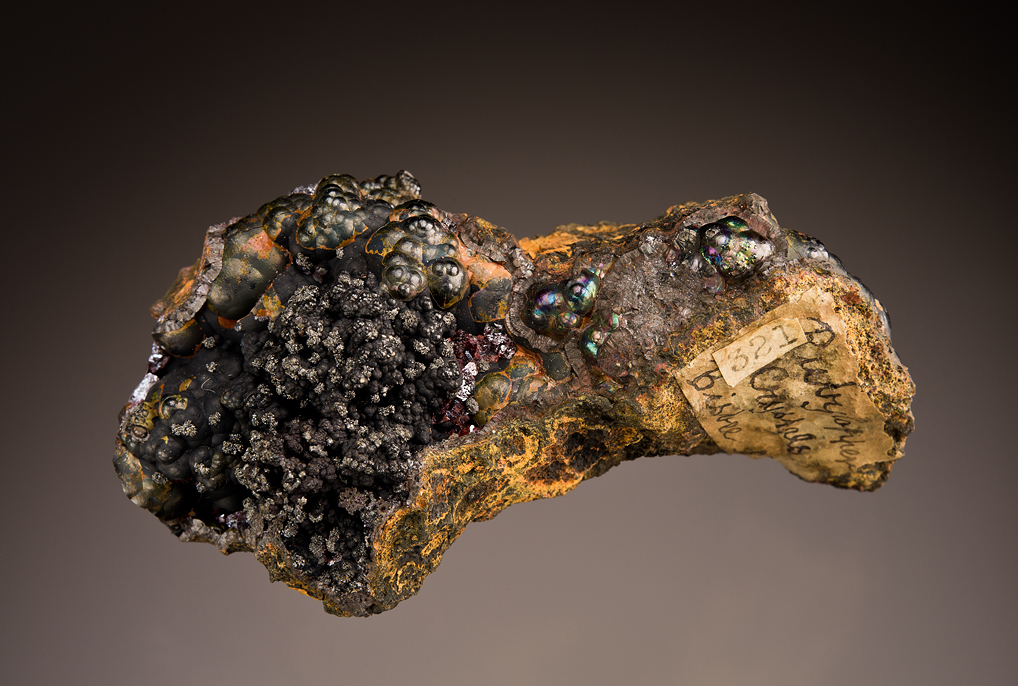 Not the prettiest cuprite from Bisbee, but this is a very cool historic specimen. The old label is wonderful, stating “ruby copper crystals, Bisbee, A.T.” Since the piece is from “Arizona Territory” that means it was collected before 1912 when Arizona attained statehood. There are several little groups of rich red cuprite crystals on the somewhat iridescent goethite matrix.