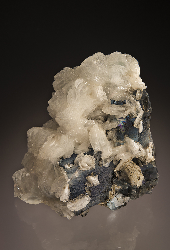 Fan-like aggregates of pale blue tabular barite crystals on translucent blue fluorite make for an appealing display piece.