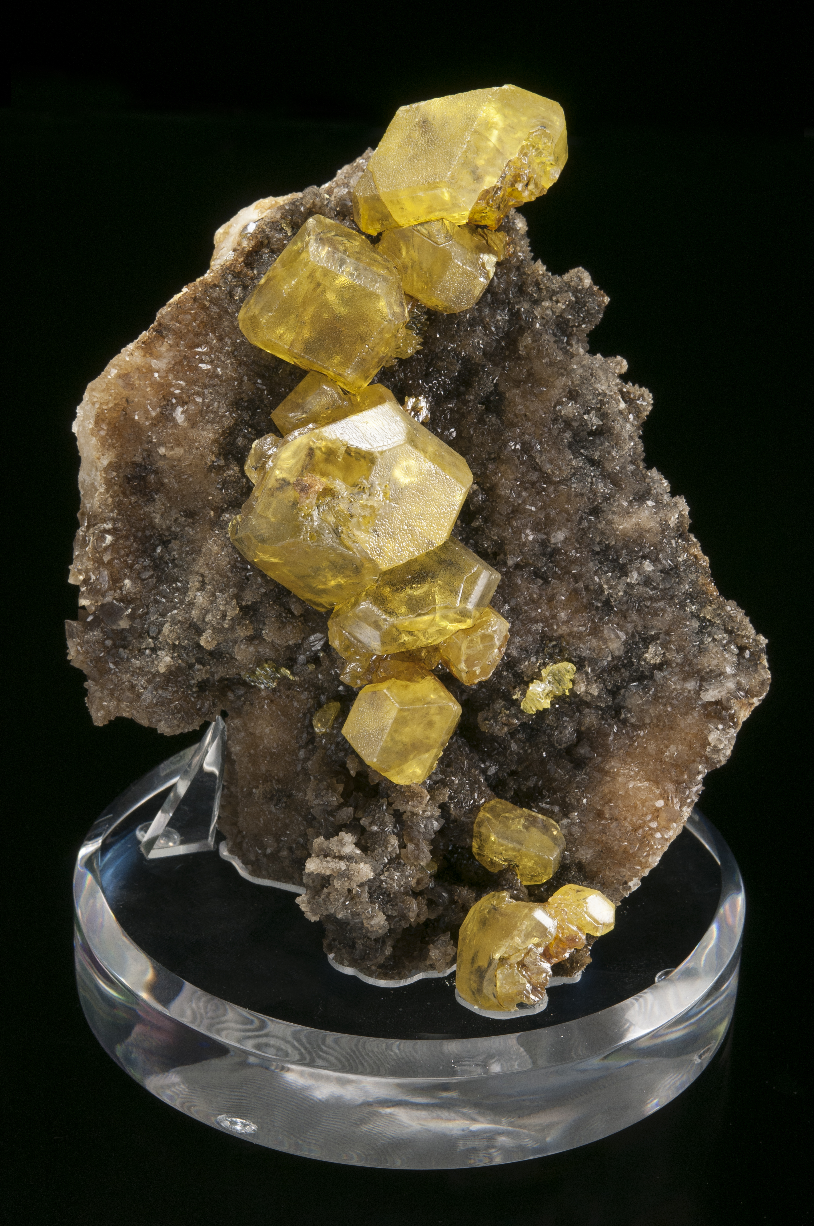 This is an exceptional specimen, with a curved line of crystals running gracefully up the center of the matrix. The geometric appeal is outstanding. The largest crystal measures 4.2 cm in length. There is an inconspicuous contact on the face of the central crystal, but it does not detract from the overall visual appeal. The specimen comes with a Sunnywood base, ready for display.