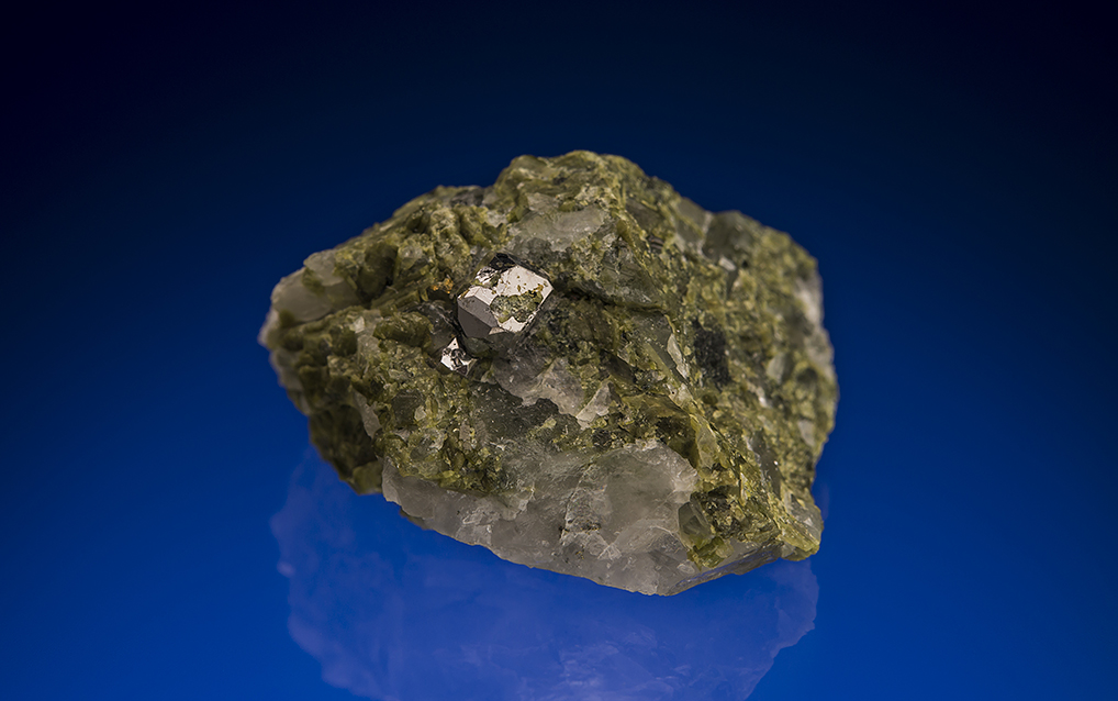 A 4 mm crystal on quartz and epidote. The crystal has been re-attached to the matrix.