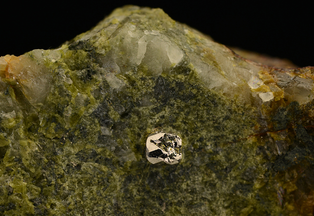 A perfect 4 mm complex crystal exposed from encasing quartz and epidote.