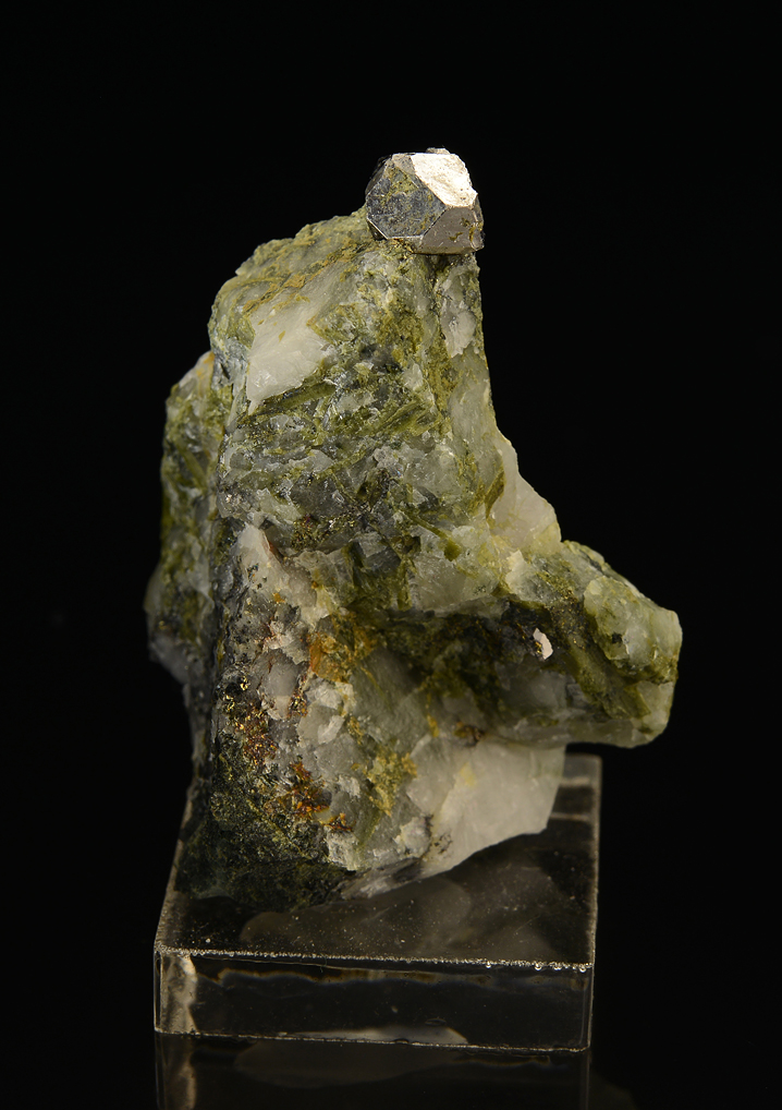A beautiful 6 mm cube-octahedron perched on quartz and epidote. The crystal has been re-attached to the matrix.