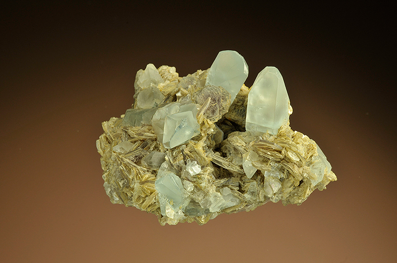 A wonderful cluster of frosted, but gemmy blue topaz crystals from Murzinka. These prismatic crystals with complex terminations are surrounded by a mass of muscovite blades as matrix. A great Russian classic.