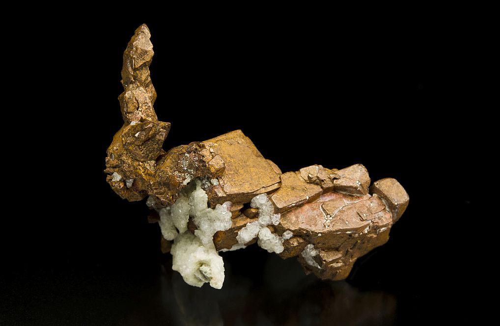 This is a fine thumbnail copper with a sharp central cubic crystal surrounded by more complex crytals. The bit of analcime at the base is a nice contrast.