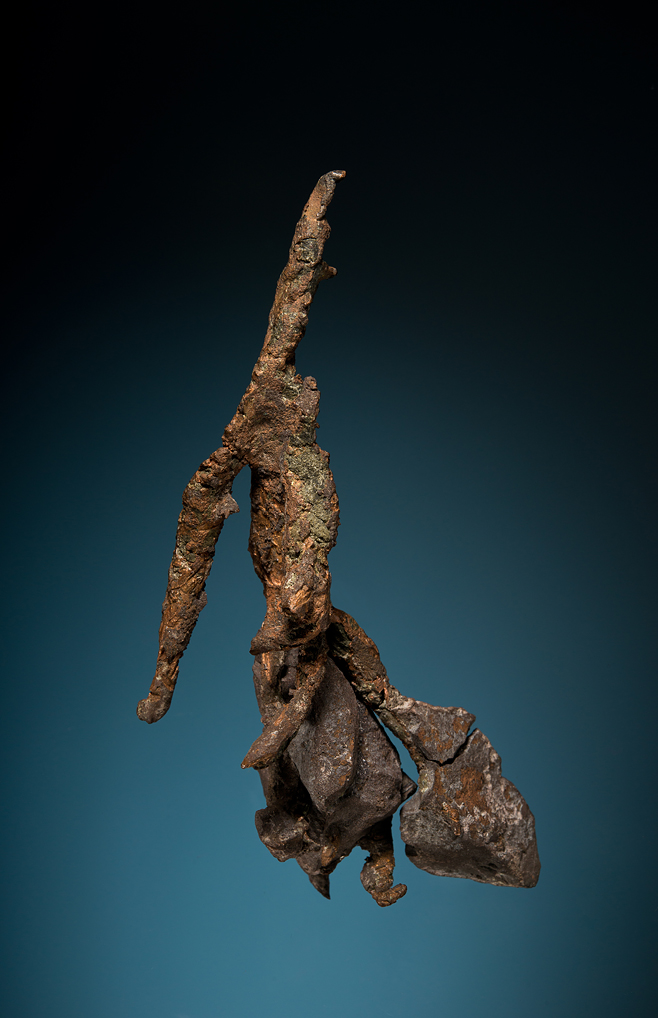 This is an unusually aesthetic example of amygdaloidal copper. The copper has filled tubular-shaped vesicles (amydgules) in the basalt matrix which has largely been broken away exposing the native copper inside.