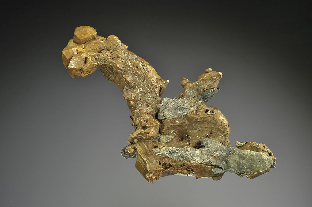 This is a sculptural mass of copper with a cluster of sharp dodecahedral crystals at the top. Two laths of native silver at the bottom make this one a quite aesthetic half-breed. The custom made Sunnywood acrylic base is included.