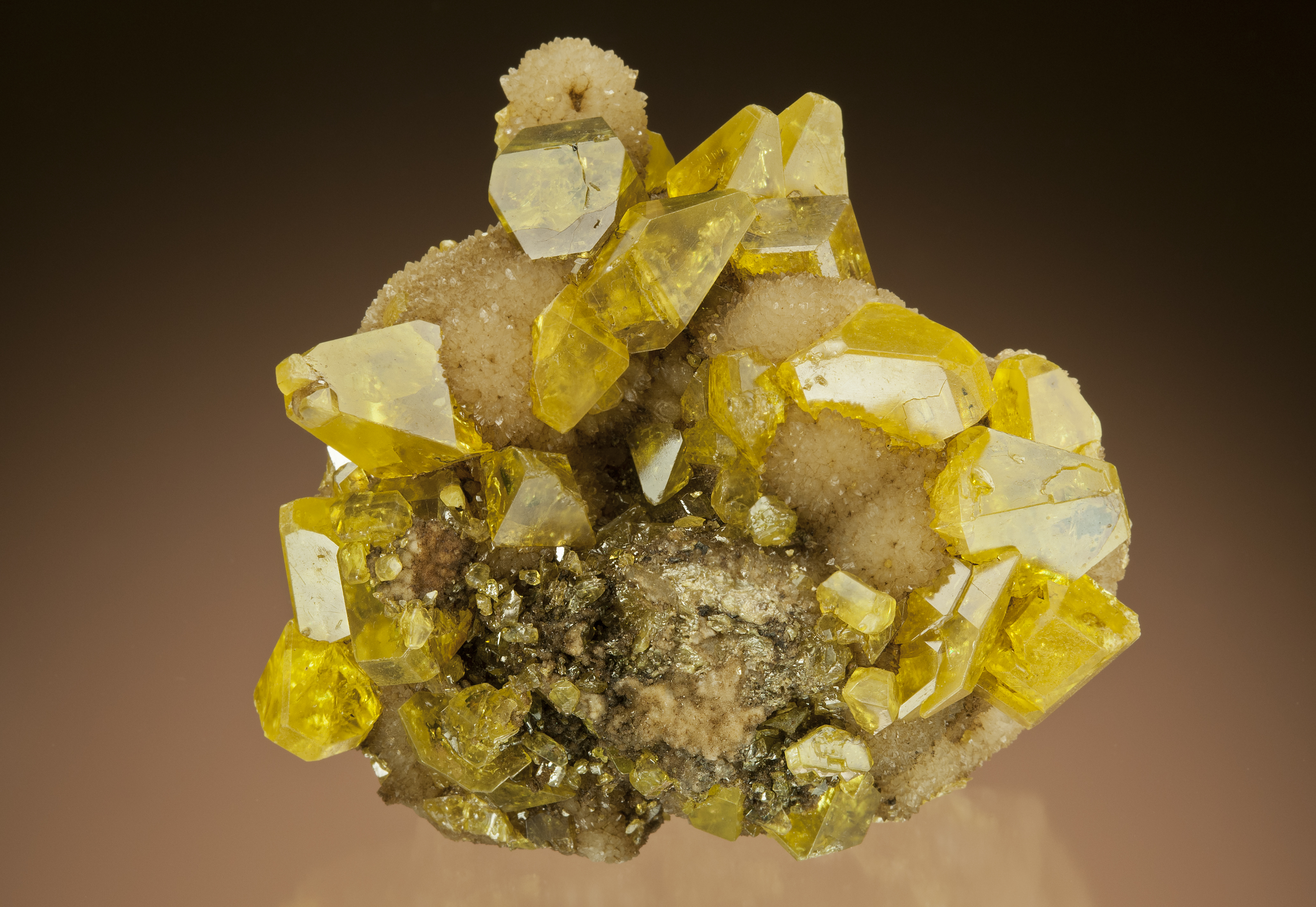 A very nice, large specimen that is covered in bright canary yellow crystals. The largest crystal measures 3.5 cm in length. This piece is beautifully accented with two "twin" pyramidal crystals at its top, making for a choice display.