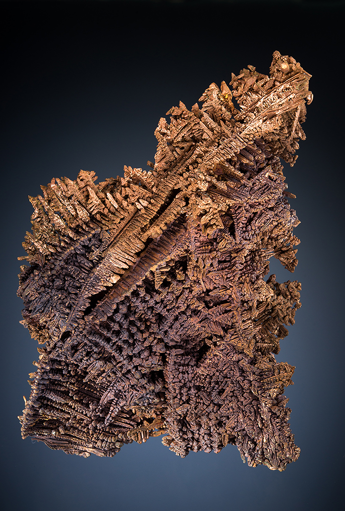 Stan Esbenshade of Midwest Minerals in Tucson has had a contract to collect mineral specimens at the Chino Mine in New Mexico for several years. Most of what he finds is bulk material, but 3 times since he has been collecting there he has found pods of truly world-class copper crystals. The specimens pictured here are from the latest find from late in 2013. All the specimens from the find were removed from encasing rock to expose the copper crystals. Each of the three finds is quite distinctive. In this case the crystals form exquisite interlocking herring-bone growths ranging from quite fine, delicate crystals to occasional very coarse stout crystals, all in quite aesthetic groups of all sizes.