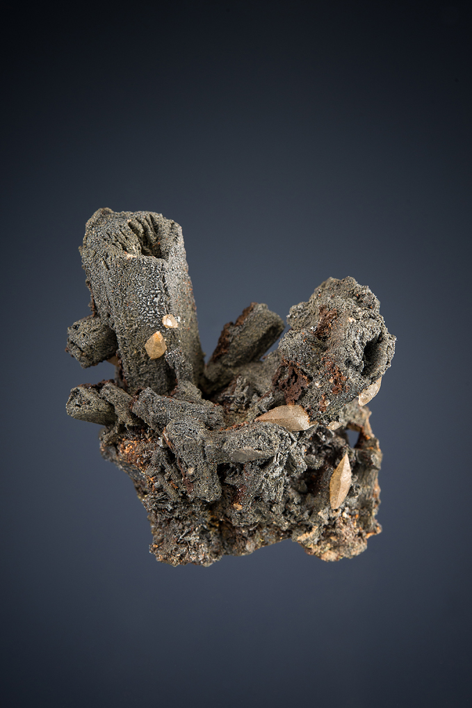 These pseudomophs after pyrargyrite are routinely labeled as acanthite, but upon microscopic examination it is clear that it is polybasite and not acanthite on this particular specimen. A quite aesthetic grouping of large crystals.