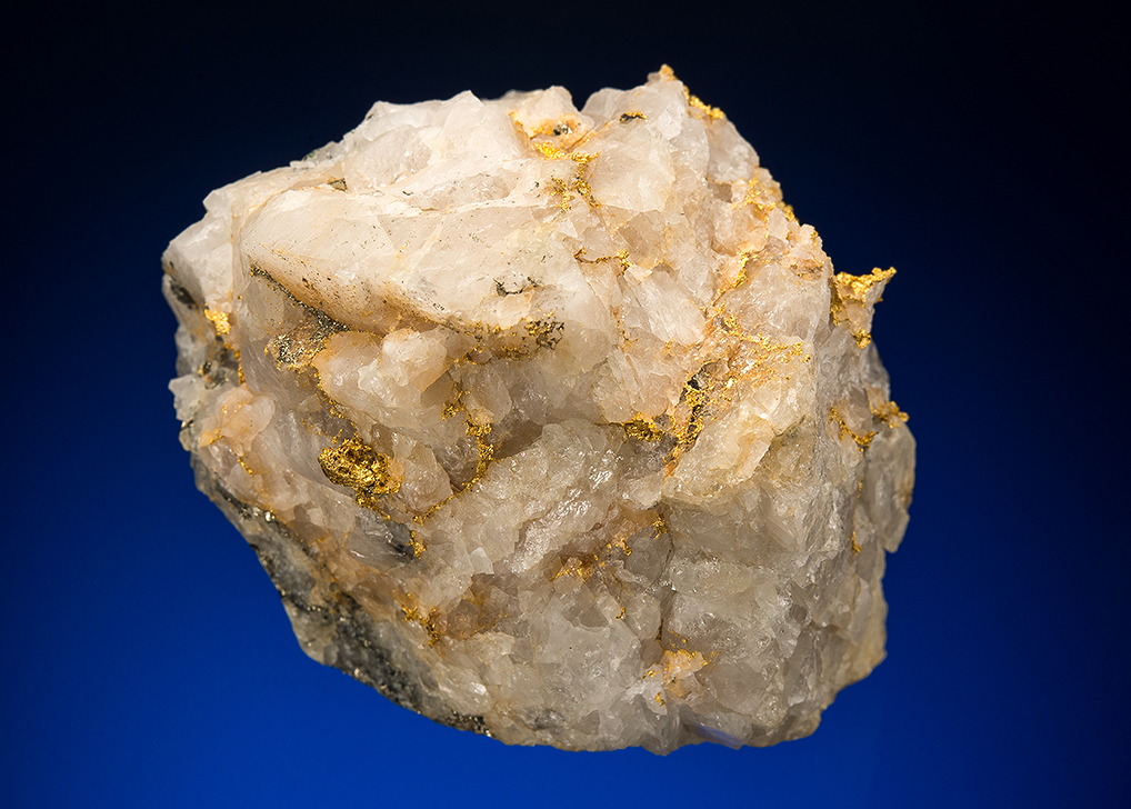 This is simply a great chunk of high-grade gold ore. Masses of bright gold are shot through the massive white quartz matrix.