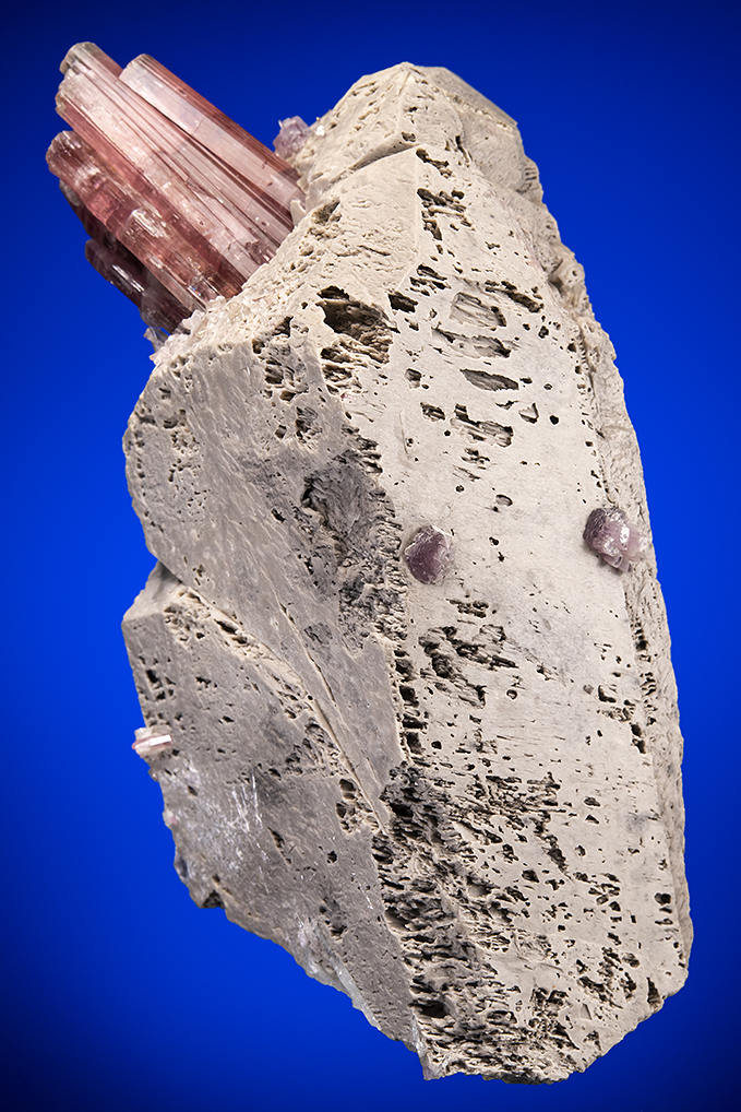 ELBAITE with LEPIDOLITE and ALBITE var. Cleavelandite on MICROCLINE (Baveno twin)