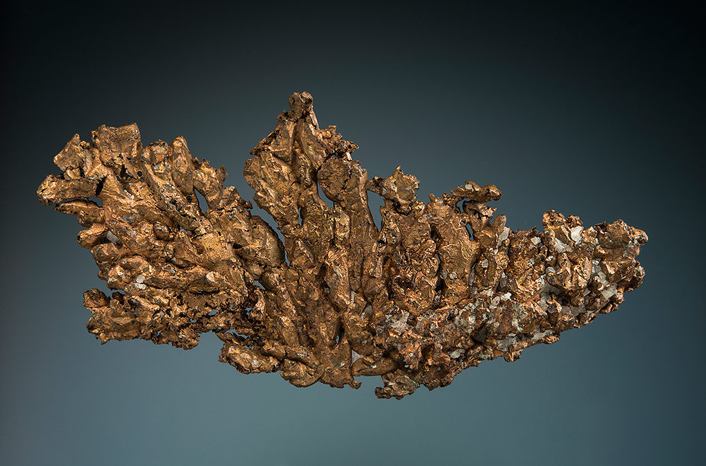 A wonderful brassy example of dendritic copper with sharp crystal faces. Small inclusions of calcite dot the surface, nested within the complex and prismatic branches of copper. Some of the calcite has been naturally etched away to produce a series of small cavities within the copper, adding a subtle intricacy to the overall form. A great specimen of fanned, crystalline copper that any collector can enjoy.