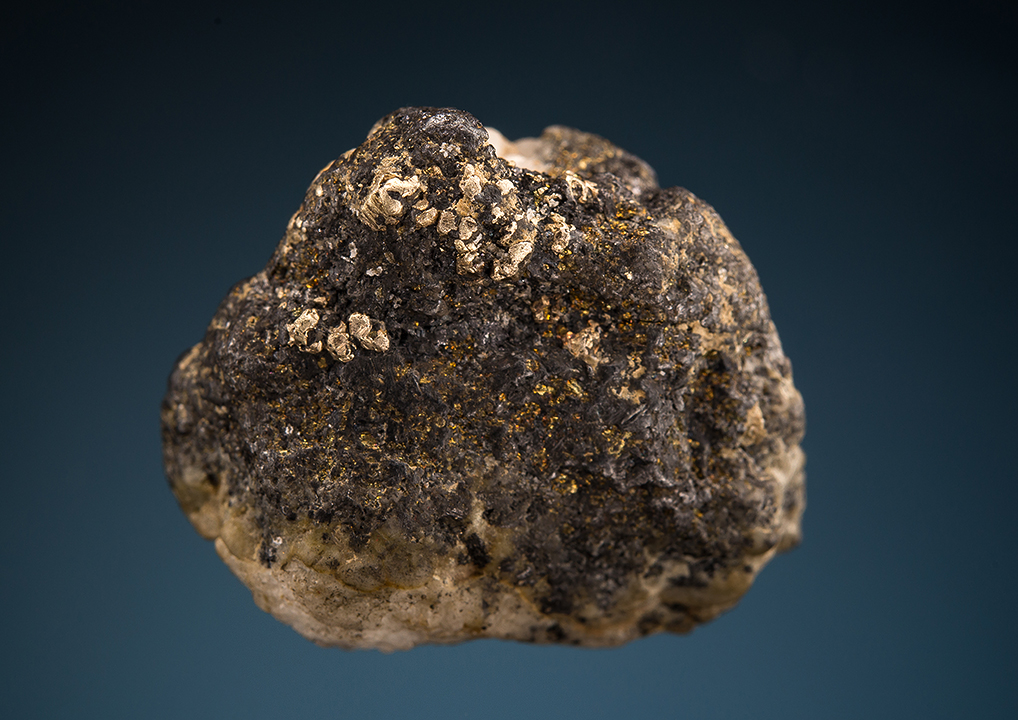 We recently got a small lot of historic Comstock Lode specimens that included a few native gold samples. These were from a collection unearthed in Idaho that was assembled presumably by a geologist from several western US mining districts. This one has several blebs of native gold in a sulfide matrix.