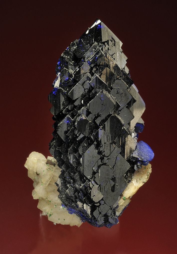 An exquisite azurite from Morocco. I love the jagged edges on the sides of the crystals and the multiple reflecting surfaces on the front of the crystal. A bit of white dolomite serves as matrix. Minette acquired this one as part of their purchase of the Leonard Bedale collection in 1985.