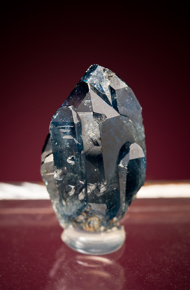 Here is one of the prized Tsumeb thumbnails, a sharp lustrous gemmy scorodite. The crystal is a beautiful blue with yellow flashes and has several smaller parallel crystals to give it a bit of character. The main crystal has the tiniest of chips at the termination, but is otherwise nearly perfect.
