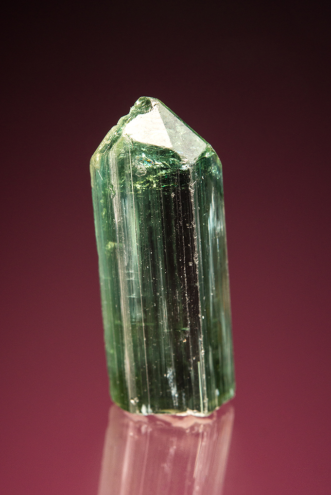 This is a classic gem green tourmaline single crystal with a complex termination.