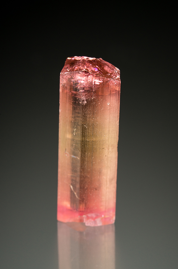 This single gem doubly terminated crystal has colors reminiscent of Himalaya Mine tourmalines. The pale yellowish-green center grades to pink on both terminations.