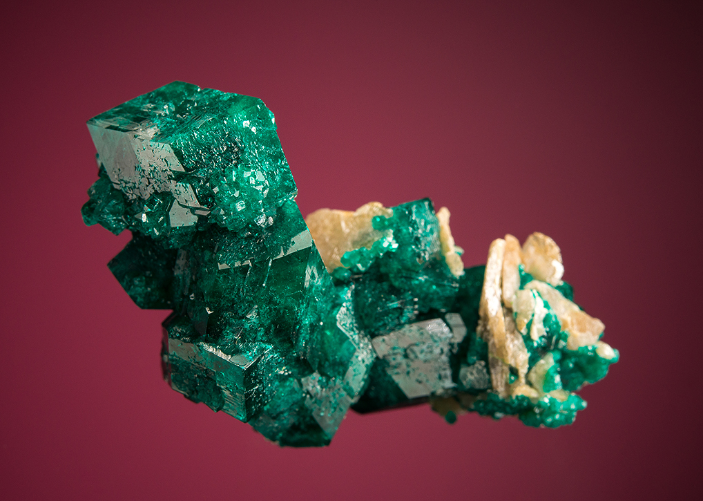 This is a pretty uncommon association for Tsumeb. The sculptural cluster of large dioptase crystals is intergrown with numerous dull yellow bladed wulfenite crystals.