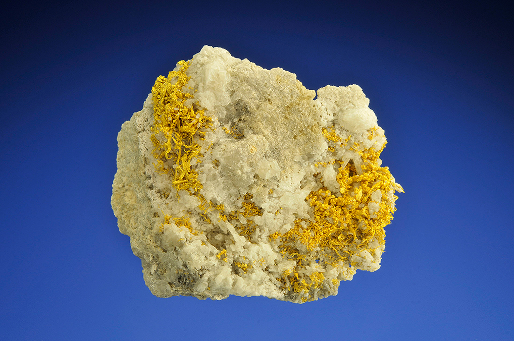 Bright crystallized leaves and wires filling vugs in white quartz.