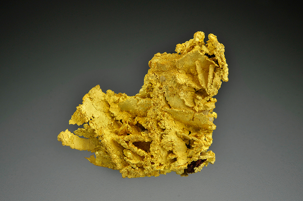 Although far more famous for silver, lead, and zinc production, Leadville, Colorado was also a major gold producer in the late 1800's and early 1900's. Notable gold mines in the area include John Campion and JJ Brown's Ibex Group (including the Little Jonny) on Breece Hill and the Printer Boy Mine in California Gulch. Collectors have been scouring the Leadville mine dumps for generations since in search of gold missed by the original miners, but potential prospectors should be aware that nearly all the gold bearing mine dumps are now posted and rules against trespassing and collecting are strictly enforced. Gold specimens from Leadville exhibit many different habits including equant crystals, crystalline leaves, ribbons and wires, and "sponge" gold. Typical "sponge" gold from Leadville often gives the appearance of crystallized gold, but the reflections that look like crystal faces are actually casts from dissolved quartz crystals.