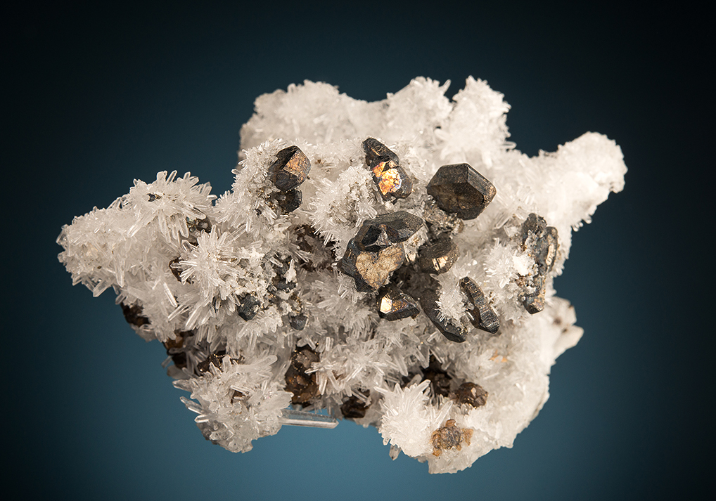This is a very aesthetic Peruvian bournonite. The small, but quite sharp tabular bournonite crystals are spaced on a sculptural matrix of white needle quartz.