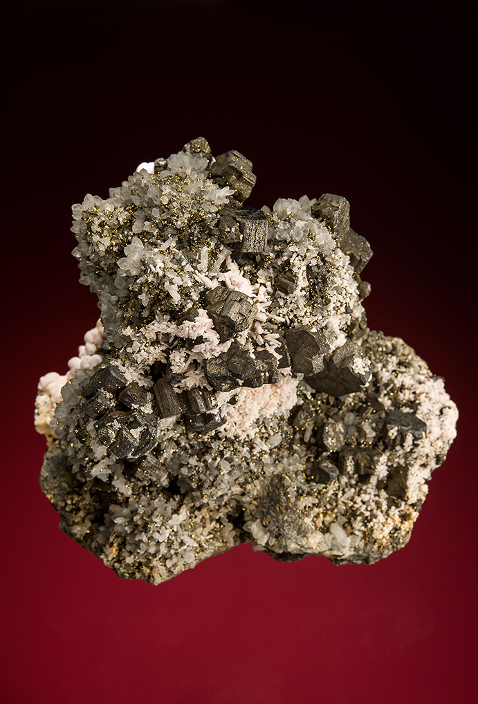 This mound of matrix is covered with drusy quartz and then scattered with sparkling pyrite crystals. About 15 thick bournonite “cogwheel” twins to 2.3 cm are spaced on the quartz and then partially overgrown with pink manganoan calcite.