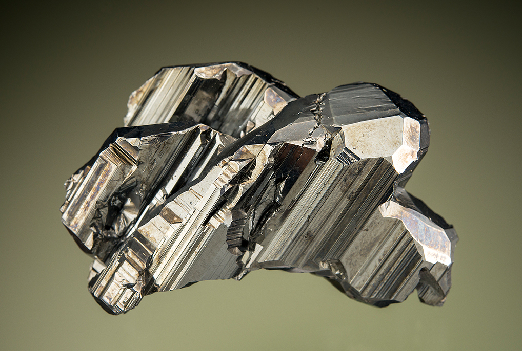 This is a floater complex twinned bournonite crystal. The luster is fantastic on the oddly formed crystal that apparently grew against another mineral to cause the indentation at the back of the specimen.