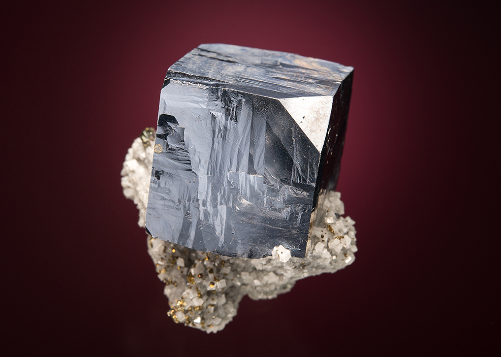 Here’s a true American classic, a single brilliant galena cube with slight octahedral modifications on a white dolomite matrix. A common mineral, but uncommon quality.