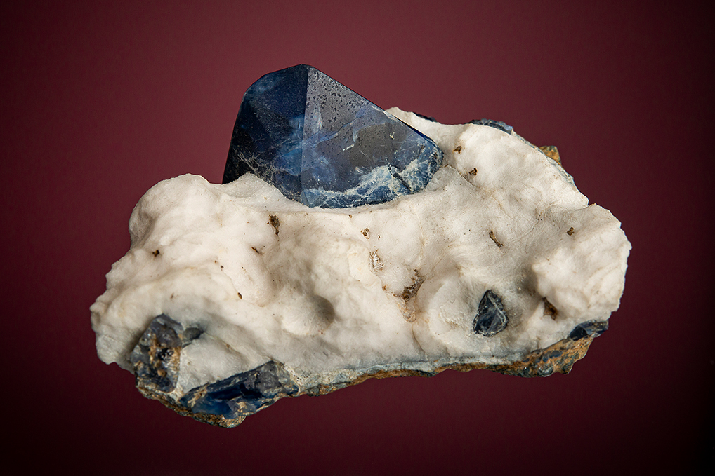 A single thick well-formed triangular benitoite crystal etched from the encasing white natrolite matrix.