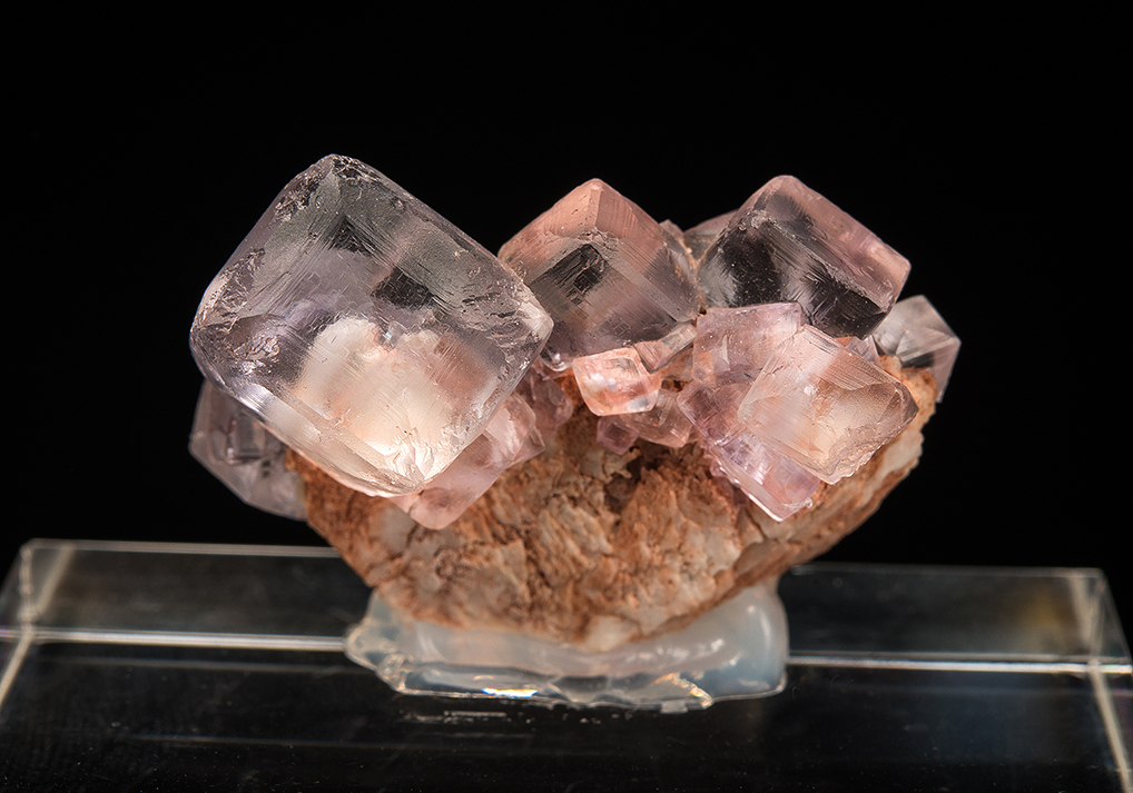 This is a beautiful cluster of water clear pale lavender fluorite crystals on a shard of matrix. The fluorite crystals exhibit several crystal forms including a dominant tetrahexahedron.