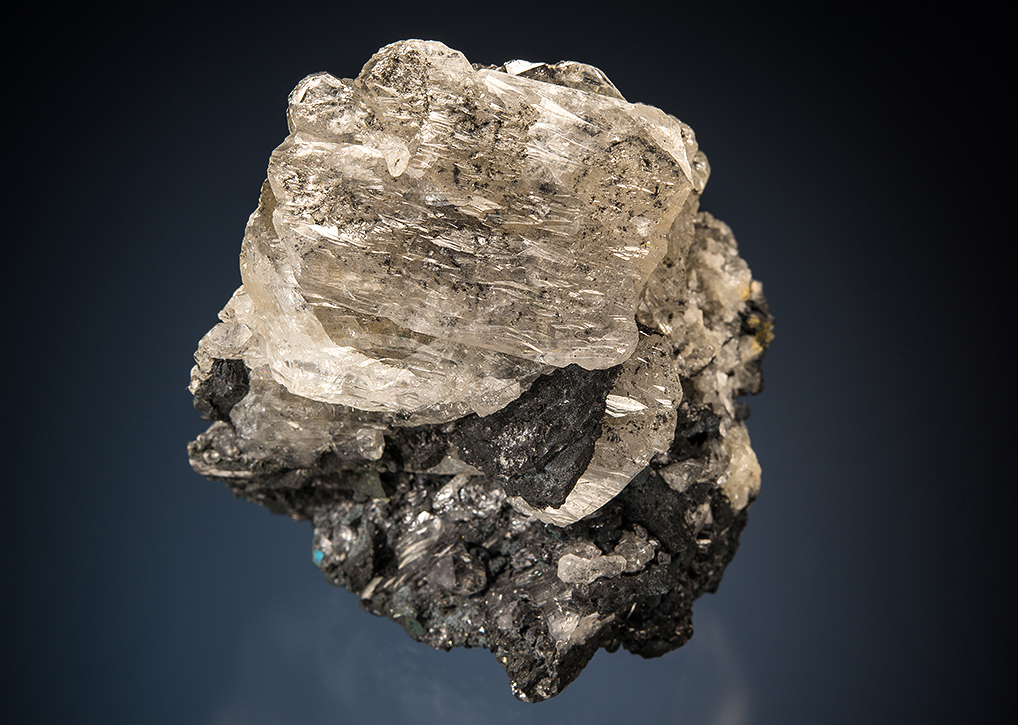 This is an impressive cluster of grayish anglesite blades to nearly 4 cm with a black, presumably galena, matrix.