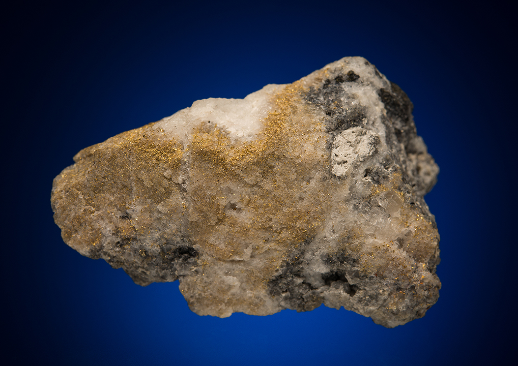 Rich gold ore specimens from the big three mines in the San Juans (Idarado, Sunnyside, Camp Bird) all look somewhat similar, but there are subtle distinctions. This one has very fine-grained gold disseminated in white quartz with minor sulfides. A very rich Idarado specimen.