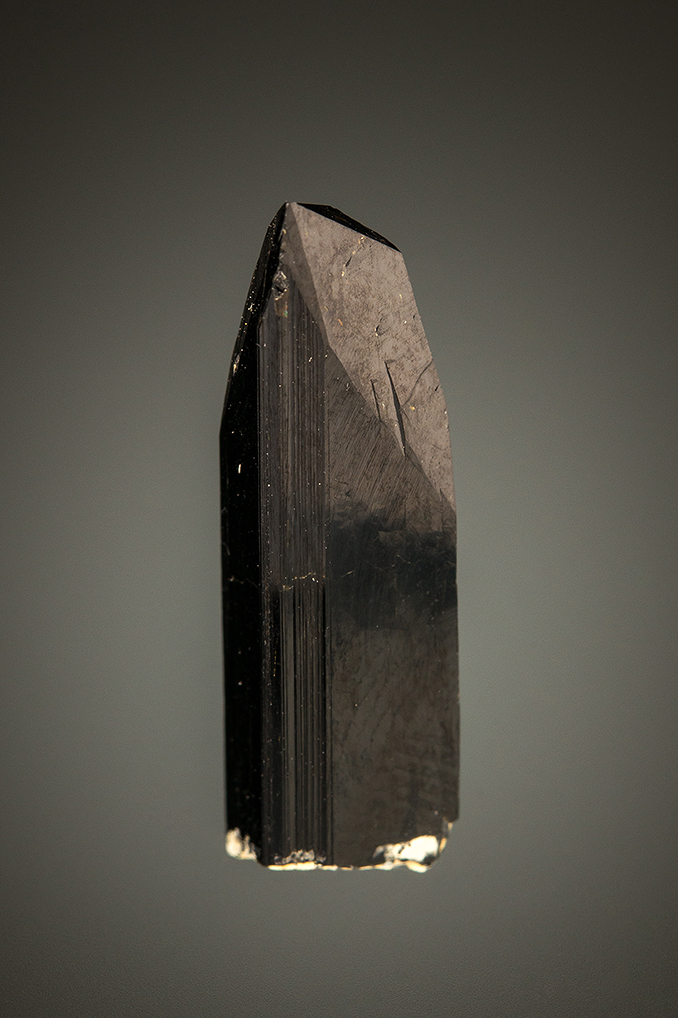 Here is a sharp lustrous single crystal of aegirine. Aegirine is often associated with other minerals at Mont St. Hilaire, but this one stands alone. Wendy and Frank Melanson acquired this one from the Neal Pfaff collection in 1979, and Neal got it from Ron Sohn in 1977 at the Louisville Show.