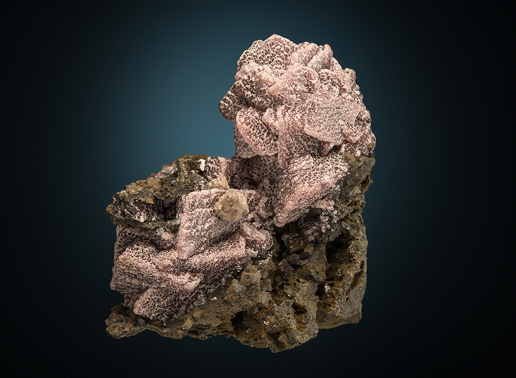 This is a rather unique rhodochrosite from Santa Eulalia. The rhombic crystals have multiple terminations on each face, and the color of the crystals is a quite dark, almost purple shade.