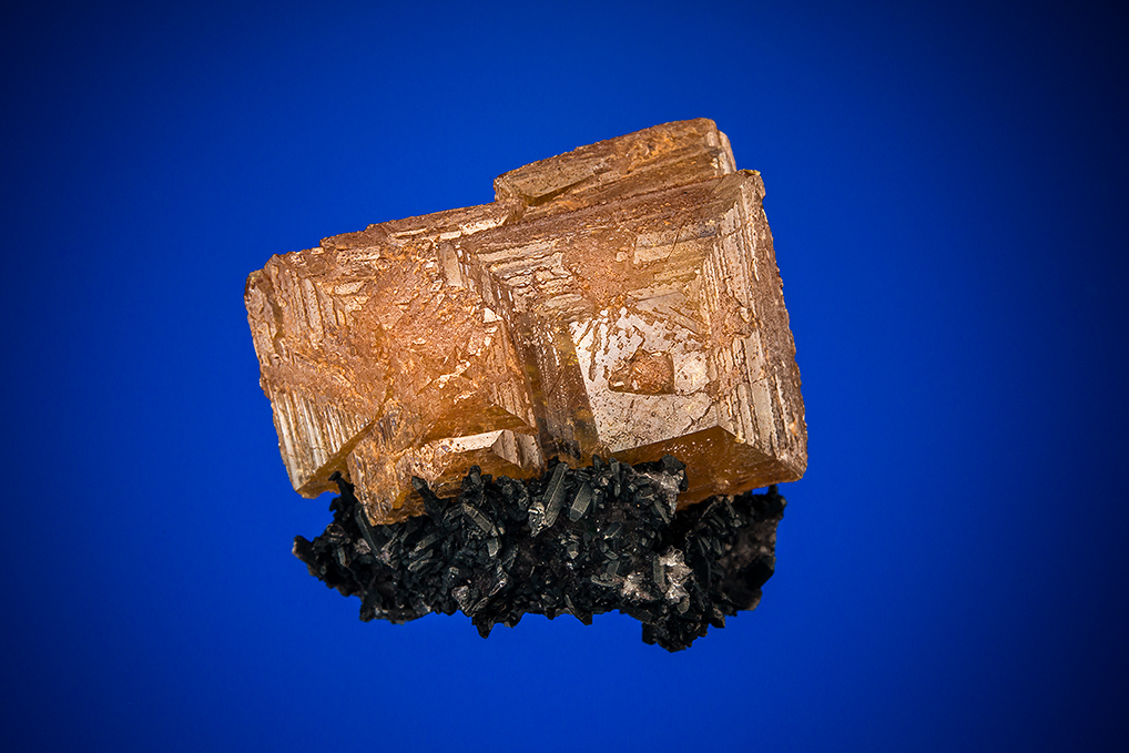 This is a huge single compound crystal on a matrix of white quartz with a black oxide coating. The wulfenite is a thick one exhibiting prominent pyramid growths and pronounced striations. This is a fantastic Tsumeb miniature from the David Byers collection.