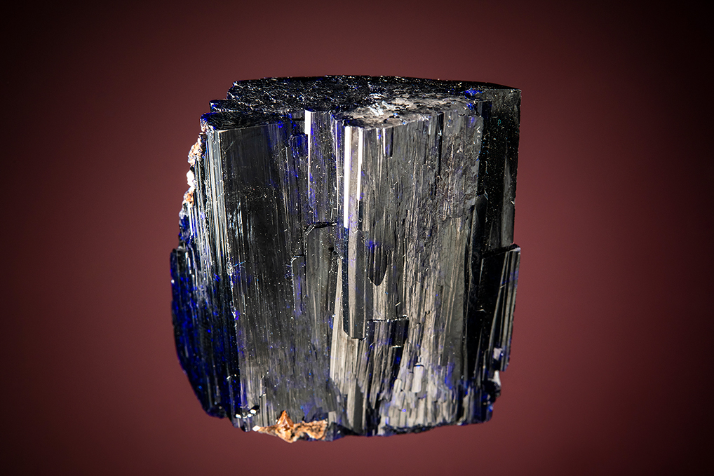 A single sharp blocky crystal with excellent luster. There is an obvious contact point on one edge where there is a bit of attached matrix.