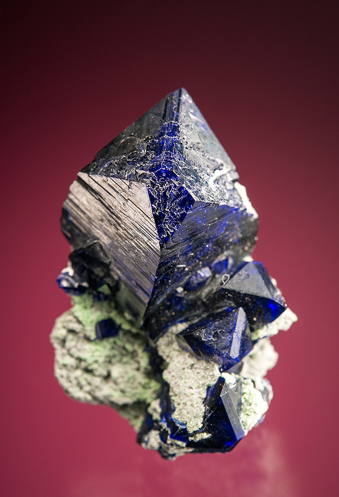A sharp pointed single crystal of lustrous blue azurite perched up on a dull green matrix. An excellent TN.