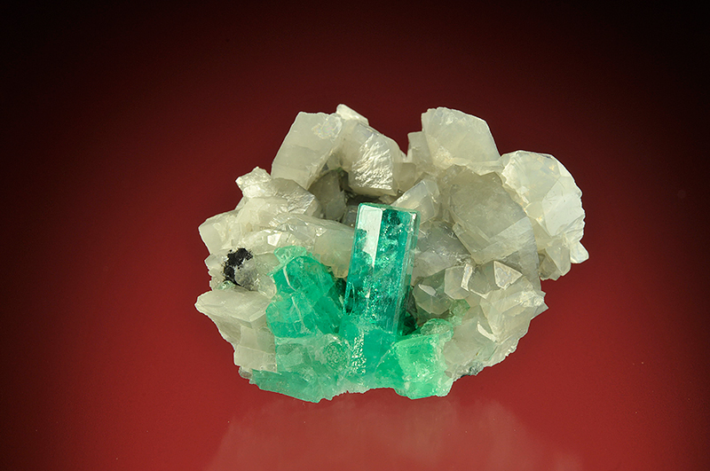 Emerald has always been coveted as one of the most precious gemstones, and emerald from Colombia is considered to be some of the best in the world. With its rich color and vibrant luster, this specimen has all of the qualities that make Colombian emeralds such a sought after item. This piece features a brilliant splay of emerald on a matrix of black shale and crudely rhombic calcite. The central emerald crystal measures 1.6 cm in length by 9 mm in width, and exhibits a wonderful internal fire. The crystal has a naturally healed fracture at its base, and a pristine flat-top termination.